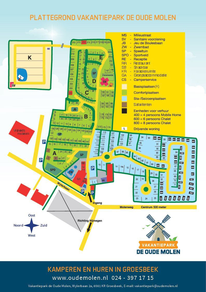 Auf ins schöne Groesbeek in Gelderland, wo sich der Campingplatz und Ferienpark De Oude Molen befindet. Ein Ort für Ruhe, Natur und Gemütlichkeit. Der Campingplatz ist wunderschön am Rande des Dorfes und gegen ein bewaldetes und abfallendes Waldgebiet gelegen.