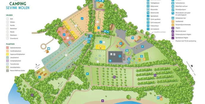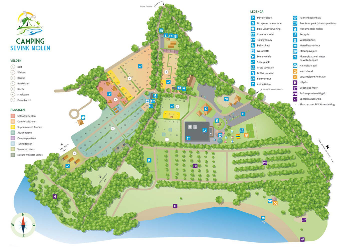Ein Wort zu diesem Namen: In der Mitte des Parks befindet sich ein nationales Denkmal, die "Sevink-Mühle". Freiwillige Helfer führen Sie gerne durch die Mühle und stellen noch immer jede Woche Mehl her, mit dem Sie leckere Pfannkuchen backen können. Zurück zum Campingplatz selbst. Ein Top-Tipp für Jung und Alt ist der saubere und schön angelegte Erholungssee 't Hilgelo. Ein schöner Ort zum Schwimmen, Essen, Surfen, Angeln oder Tretbootfahren. Letztere können gemietet werden. Wenn Sie all diese sportlichen Aktivitäten aus der Ferne beobachten möchten, können Sie im Strandpavillon einen Drink zu sich nehmen.