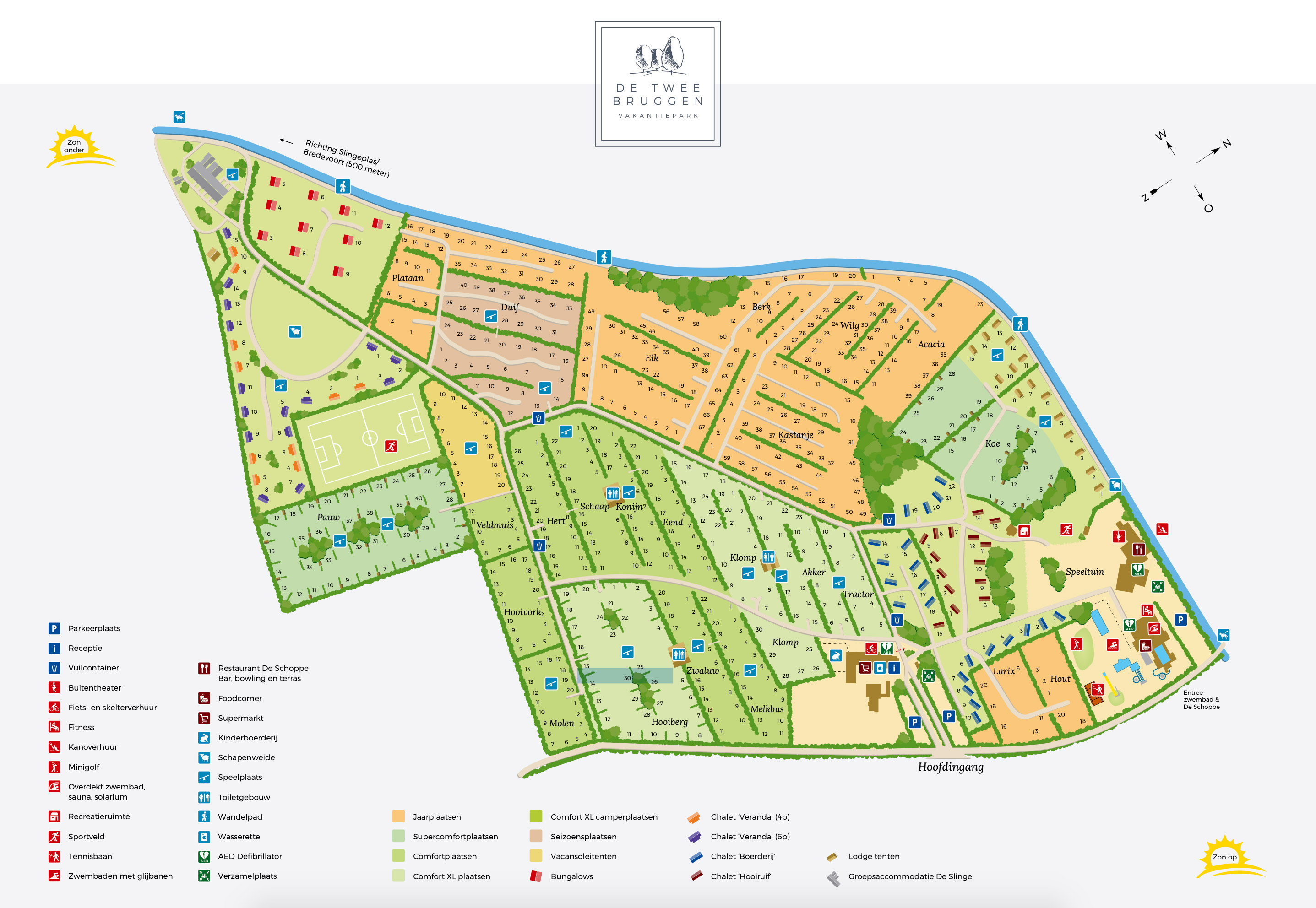 Vakantiepark De Twee Bruggen ist ein großer Familiencampingplatz in Gelderland mit großzügigen, grünen Stellplätzen auf Feldern inmitten der Natur. Sie können komfortable Unterkünfte und luxuriöse Einrichtungen wie den Super-Komfort-Campingplatz mit eigenen Sanitäranlagen oder ein voll ausgestattetes Lodgezelt mieten.
