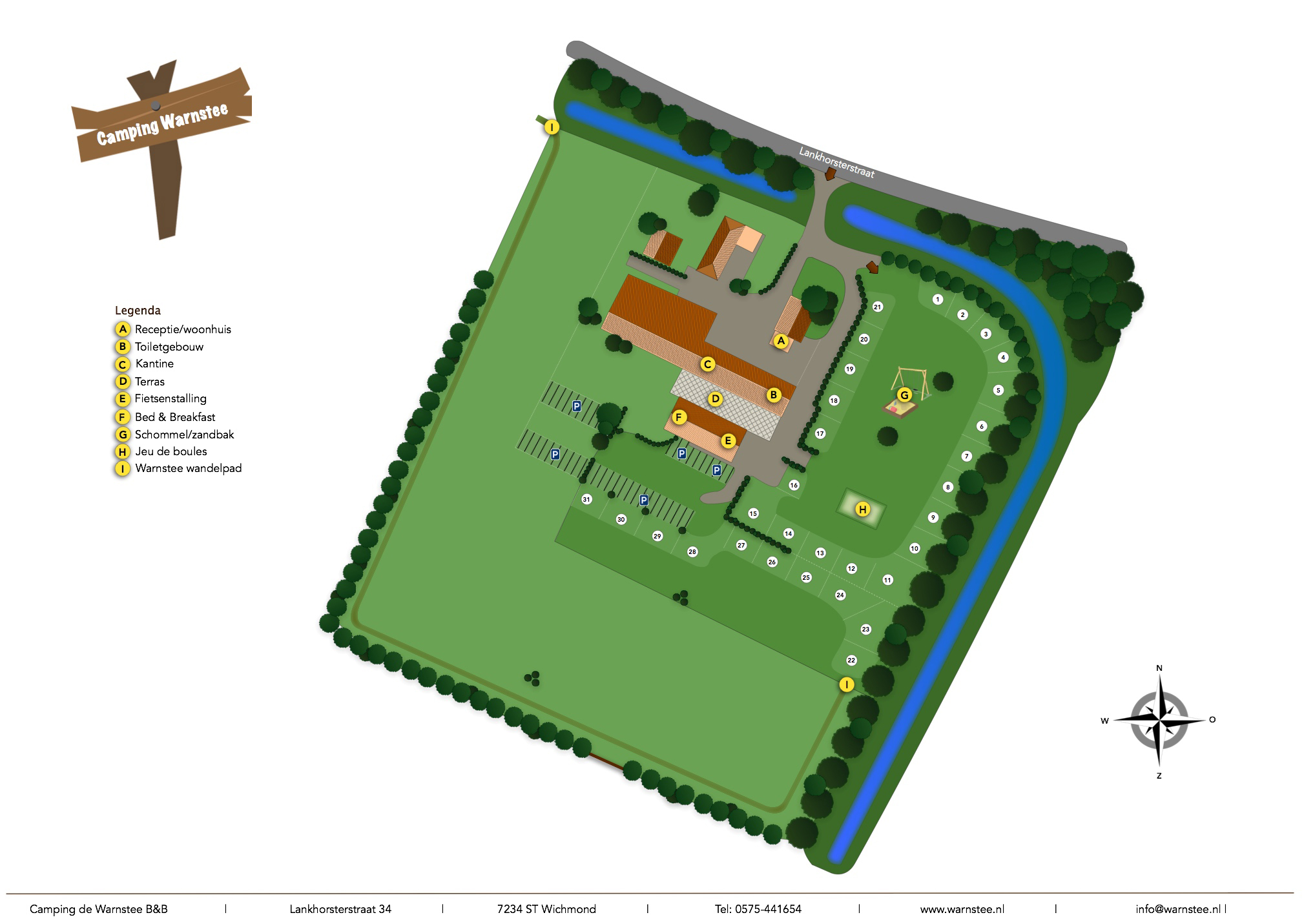 Der Campingplatz verfügt über 30 Stellplätze mit Kunstrasen, Wasseranschluss und Abfluss am Platz, beheizte Sanitäranlagen und einen überdachten Fahrradschuppen. Der Campingplatz verfügt über einen kleinen Aufenthaltsraum mit lustigen Aktivitäten, einen Billardtisch, aber auch ein Kneipenabend und eine Fritteuse sind bei den Gästen sehr beliebt. Neben dem Campingplatz gibt es einen B&B-Mietwohnwagen und eine Blockhütte zu mieten.