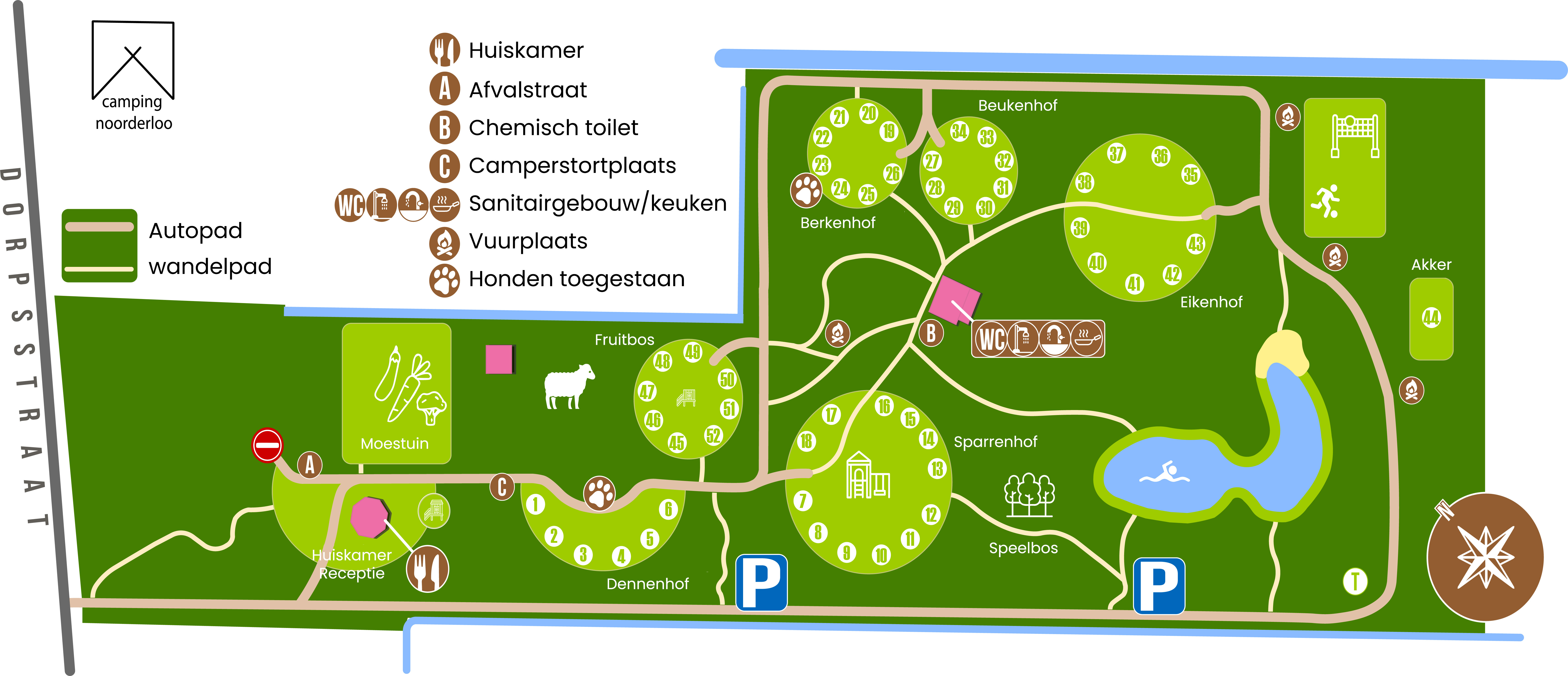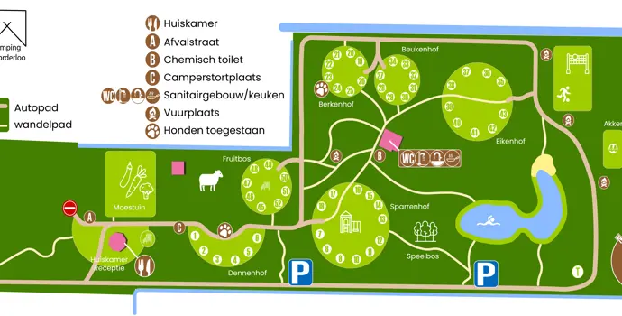 Was für ein schöner, überschaubarer Platz, autofrei und überall schöne Spiel- und Rastplätze. Es gibt insgesamt 51 Campingplätze und zwei Wanderhütten. Die Campingplätze sind kreisförmig angelegt, und einige haben in der Mitte einen Spielplatz. Hier gibt es jede Menge Spielmöglichkeiten; kommst du mit und baust Hütten im Spielwald? Es gibt eine Selbstbedienungsbar für diejenigen, die ein Getränk oder ein Eis essen möchten. Es gibt auch einige Lebensmittel zu kaufen.