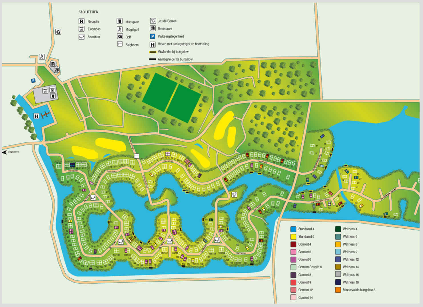 Es stehen nicht weniger als 19 Arten von Ferienunterkünften zur Auswahl. Es gibt Doppelhaushälften und freistehende Häuser, die von 4 bis 24 Personen reichen. Entscheiden Sie sich für ein Wellness-Haus und genießen Sie den vorhandenen Whirlpool, die Sauna, den Whirlpool, die Massagedusche oder die Infrarotkabine. Die Ausstattung ist je nach Haustyp unterschiedlich. Sie können auch Häuser mit besonderen Vorzügen buchen: zum Beispiel ein Haus mit Fischsteg, Gartenzaun, Kamin oder eigenem Bootssteg. Der Ferienpark Emslandermeer ist ein ruhiger, grüner und wasserreicher Familienpark ohne Animation. Aber er verfügt über verschiedene Sporteinrichtungen und viele Spielplätze. Spielen Sie gemeinsam eine Partie Jeu de Boules oder Minigolf.