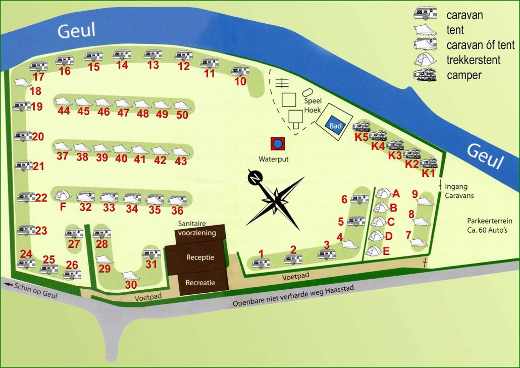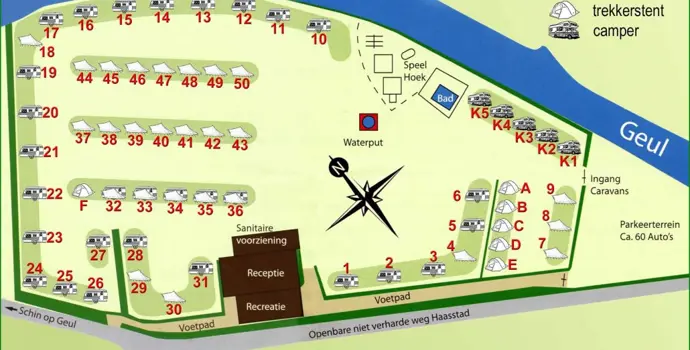 Auf dem Gelände finden Sie 56 Stellplätze, von denen fünf für Wohnmobile reserviert sind. Bevorzugte Stellplätze können entlang der Geul reserviert werden. Auf diesem Campingplatz gibt es keine Mietunterkünfte. Die Gäste kommen wegen der Ruhe und der Natur hierher, obwohl Hunde willkommen sind. Da der Campingplatz autofrei und übersichtlich angelegt ist, können Kinder hier frei spielen. Es gibt verschiedene Spielgeräte, einen Tischfußball, ein großes Schachbrett und ein Kleinkinderbecken. Auch in den beheizten Sanitäranlagen gibt es Einrichtungen für Kleinkinder. Die Campinggäste treffen sich gerne im Aufenthaltsraum mit Fernseher, an der Feuerstelle oder an der überdachten Kochstelle auf der Wanderwiese. Für Zeltcamper gibt es auch einen Kühlschrank und eine Gefriertruhe. An der Rezeption finden Sie einen kleinen Laden für vergessene Lebensmittel. Das Dorf Wijlre mit seinen verschiedenen Geschäften ist ebenfalls leicht zu Fuß zu erreichen.
