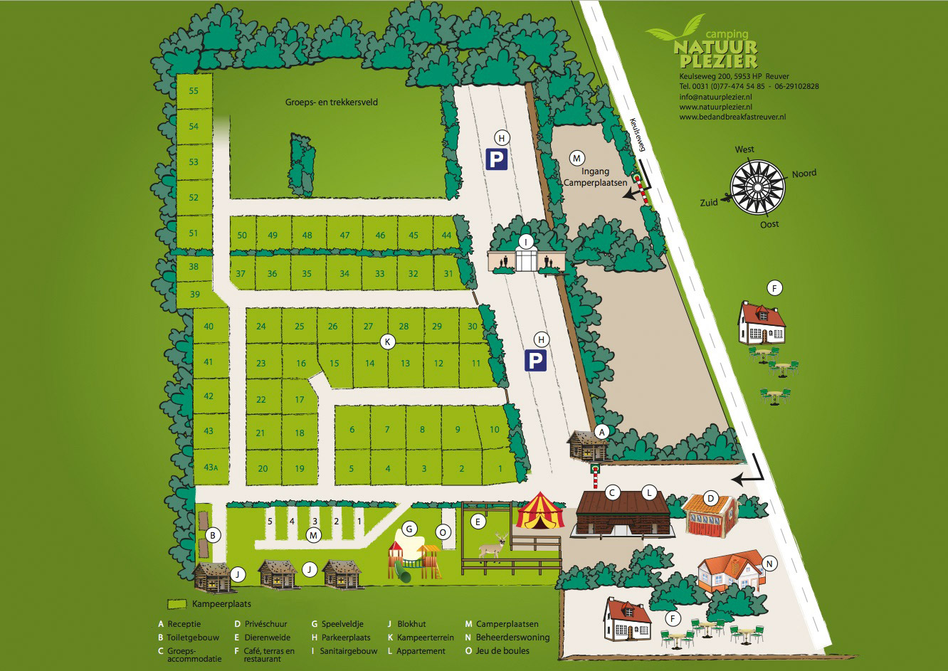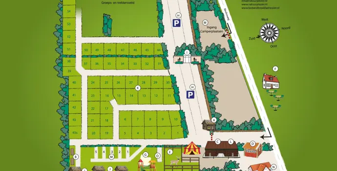 Die geräumigen Stellplätze sind in Reihen angeordnet und von viel Grün umgeben. Es gibt ein separates Gruppen- und Wanderfeld sowie einige Dauerstellplätze. Die Stellplätze sind alle mit Strom-, TV- und Wifi-Anschlüssen ausgestattet. Sie können auch gerne ein Wohnmobil mitbringen, für das es fünf Stellplätze gibt. Kinder können sicher auf dem Spielplatz, in der Spielscheune oder auf der Tierweide spielen, denn der Campingplatz ist komplett autofrei. Ihr Auto können Sie auf dem Zentralparkplatz abstellen. Für einen Snack oder ein Getränk können Sie die Terrasse, das Café und das Restaurant besuchen. Sie können auch Ihre Boulekugeln einpacken, denn auf dem Campingplatz gibt es einen Bouleplatz. Camping Natuurplezier verfügt nicht über ein eigenes Schwimmbad, das finden Sie im nahe gelegenen Dorf Reuver. In dem touristischen Dorf Reuver finden Sie auch viele Supermärkte, Geschäfte, Restaurants und Terrassen.