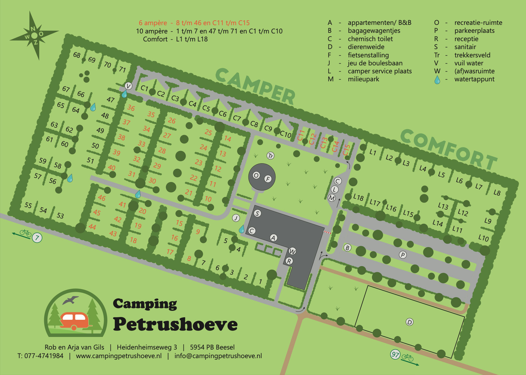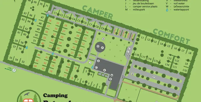 Der Campingplatz liegt in einer waldreichen Umgebung an der Grenze zwischen Nord- und Mittellimburg zwischen den Städten Roermond und Venlo. Die Stellplätze des Campingplatzes sind groß. Wählen Sie Ihren Platz auf einem der Felder, wo die Stellplätze durch niedrige Hecken voneinander getrennt sind. Es gibt separate Stellplätze für Wohnmobile und ein separates Wanderfeld. Um den ländlichen Charakter und die Ruhe zu bewahren, ist der Campingplatz autofrei und auch frei von Haustieren. Es gibt keine Saison- oder Jahresstellplätze. Die Sanitäranlagen des Campingplatzes sind gut gepflegt und im Waschraum gibt es eine Waschmaschine und einen Trockner. An der Rezeption finden Sie eine Bibliothek, Touristeninformationen, einen Fahrradverleih, einige "vergessene" Lebensmittel und ein leckeres Eis. In den nahe gelegenen Orten Reuver und Swalmen gibt es mehrere Supermärkte. Der Campingplatz verfügt nicht über ein eigenes Schwimmbad, aber in der Nähe gibt es ein Strandbad, ein subtropisches Schwimmparadies und zwei Freibäder. Die Übernachtung ohne eigene Campingausrüstung ist auch in einer der Ferienwohnungen oder in einem Bed & Breakfast möglich. Ideal, wenn Sie Gäste auf dem Campingplatz empfangen, die dort übernachten wollen, oder wenn Sie selbst auf dem Pieterpad unterwegs sind.