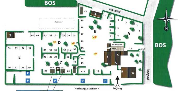Der Campingplatz ist besonders für Senioren, Ruhesuchende und junge Familien geeignet. Diese Zielgruppen wählen auf den verschiedenen Feldern des Campingplatzes ihre ideale Art zu campen. Es gibt einen Platz für Ruhesuchende, einen Platz für junge Familien mit Spielzeug und Spielgeräten und einen Komfortplatz mit eigenen Sanitäranlagen. Insgesamt gibt es fünf Parzellen mit fünfzig Stellplätzen. Der Campingplatz ist komplett autofrei, Wohnmobile sind willkommen. Der Campingplatz verfügt über verschiedene Einrichtungen, die den Urlaub besonders angenehm machen, wie z. B. einen Bouleplatz, einen Bauerngolfplatz und Bogenschießen. Es gibt ein wöchentlich wechselndes Programm an Aktivitäten, das von Spiele- und Musikabenden bis hin zu einer organisierten Fahrradtour reicht. Sie brauchen nicht jeden Tag zu kochen, denn es gibt eine Snackbar und eine kleine Speisekarte, und Brot kann auch bestellt werden. In der Hochsaison werden verschiedene Aktivitäten für Kinder bis zu 10 Jahren organisiert. Bei schönem Wetter stellt der Campingplatz ein Schwimmbad und/oder eine Wasserrutsche speziell für die Kleinsten auf. Die Kinder können draußen mit den verschiedenen Go-Karts, Rollern und Dreirädern spielen. Bei schlechtem Wetter können die Kinder in der Kantine basteln oder sich einen Film ansehen.