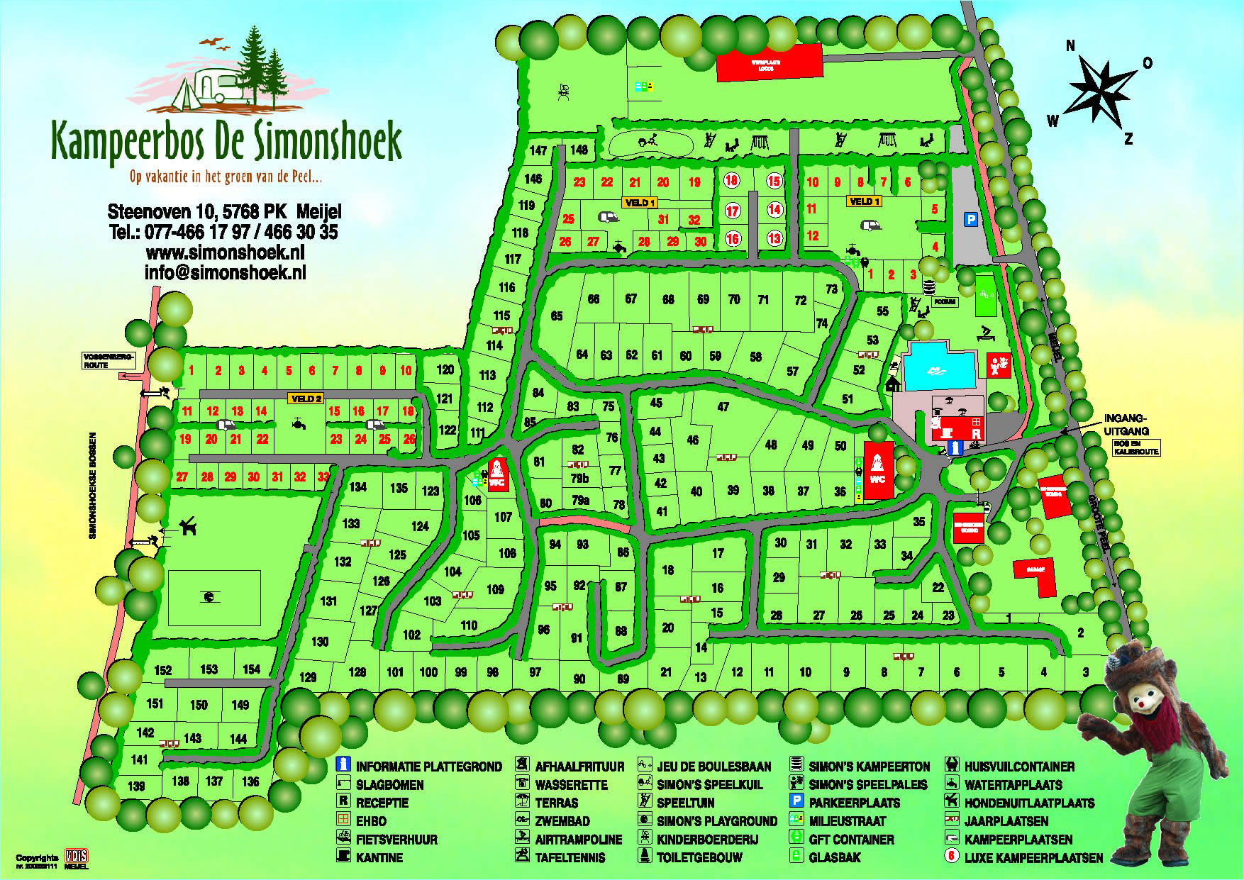 Der Campingplatz verfügt über etwa 70 geräumige Stellplätze, Saisonplätze, Jahresplätze und originelle Mietunterkünfte und wird von einer Vielzahl von Gästen besucht: von jung bis alt und von aktiv bis entspannt im Wohnwagen. Kinder amüsieren sich auf dem Air-Trampolin, dem Multisportplatz und verschiedenen Spielplätzen. Sie können gerne kommen und sich Ihren Lieblingsplatz im Voraus aussuchen. Entscheiden Sie sich für einen Platz auf einem kleinen Campingfeld, einen sonnigen Stellplatz oder lieber einen abgegrenzten Platz mit viel Grün? Alle Stellplätze sind auch für Wohnmobile geeignet. Die Sanitäranlagen sind sauber und beheizt. Simon's Swimming Arena ist ein Hallenbad mit einer sehr angenehmen Wassertemperatur. Bei schönem Wetter lässt sich das Schiebedach öffnen, so dass ein schönes Außenschwimmbad entsteht. Jeden Tag gibt es gesonderte Zeiten, in denen nur Erwachsene ihre Bahnen schwimmen dürfen. Während der anderen Öffnungszeiten können auch die Kinder schwimmen und planschen. Für die Kleinen gibt es einen separaten Kinderbereich mit einer schönen Rutsche. Das Restaurant D'n Dennenappel mit seiner gemütlichen Terrasse im Wintergarten blickt auf das Schwimmbad und bietet heiße und kalte Getränke, Eisbecher oder ein abgepacktes Eis und die Möglichkeit, bei einem leckeren Cappuccino die Zeitung zu lesen.