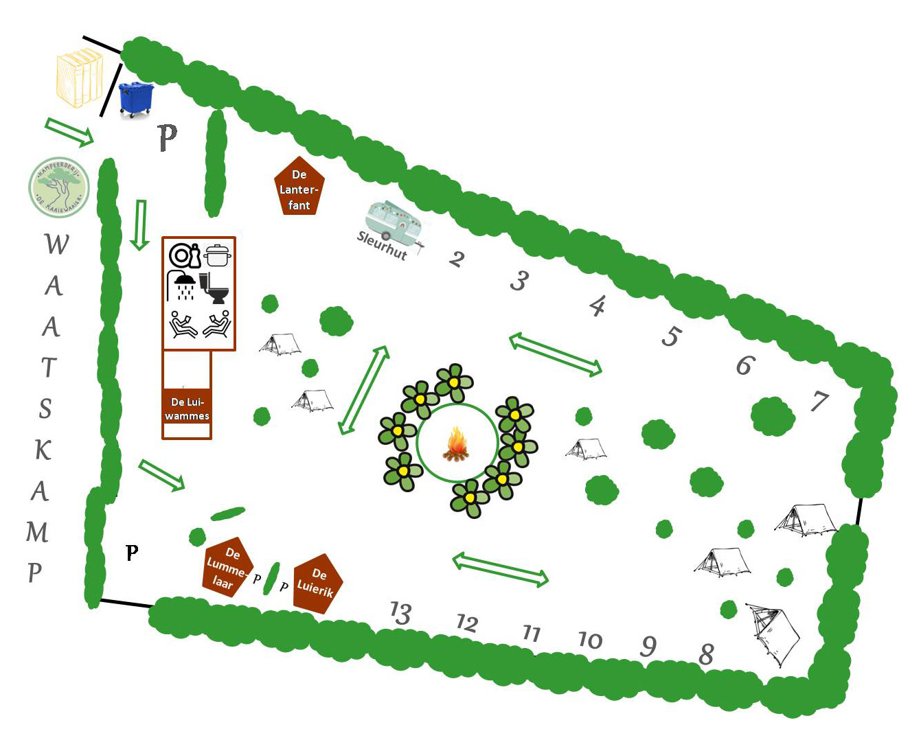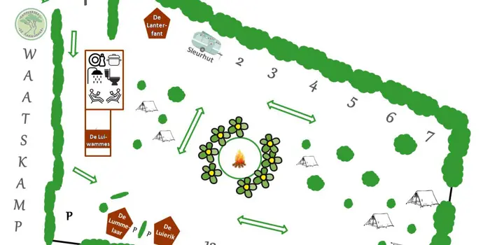 Der Campingplatz bietet 15 geräumige Stellplätze mit Stromanschluss. Vor diesen Stellplätzen befinden sich Fliesen, auf denen das Vorzelt stehen kann. Jeder Stellplatz hat einen eigenen 6-Ampere-Stromanschluss. Die Wohnwagen/Camper werden kreisförmig am Rande des Feldes geparkt, das von hohen Bäumen umgeben ist. Es gibt auch Platz für einige Zelte/Wohnmobile. Diese Stellplätze ohne Stromanschluss sind über das ganze Feld verteilt. Koch- und Essgelegenheit, Kühlschrank und Kaffee/Tee sind im Gemeinschaftsraum vorhanden.