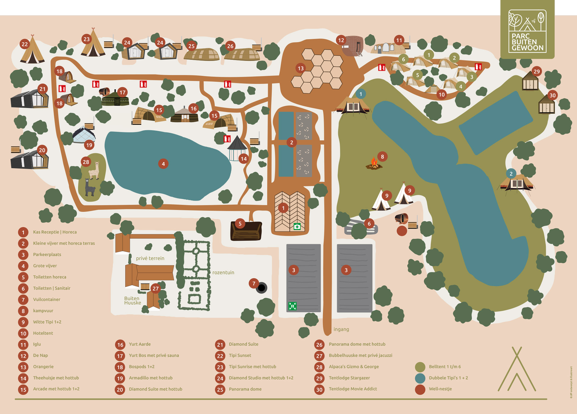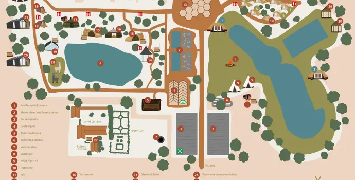 Ein wahres Glamping-Paradies ist das, was Parc Buitengewoon sicherlich genannt werden kann. Camping ohne Schlepperei und die Wahl aus nur mehr als 20 verschiedenen Unterkünften. Bei Ihrer Ankunft werden Sie herzlich willkommen geheißen und erhalten eine Führung über das Gelände. Lassen Sie sich dann im Gewächshaus oder auf der Terrasse am Teich nieder und genießen Sie ein Stück echten Limburger Vlaai (Flan).