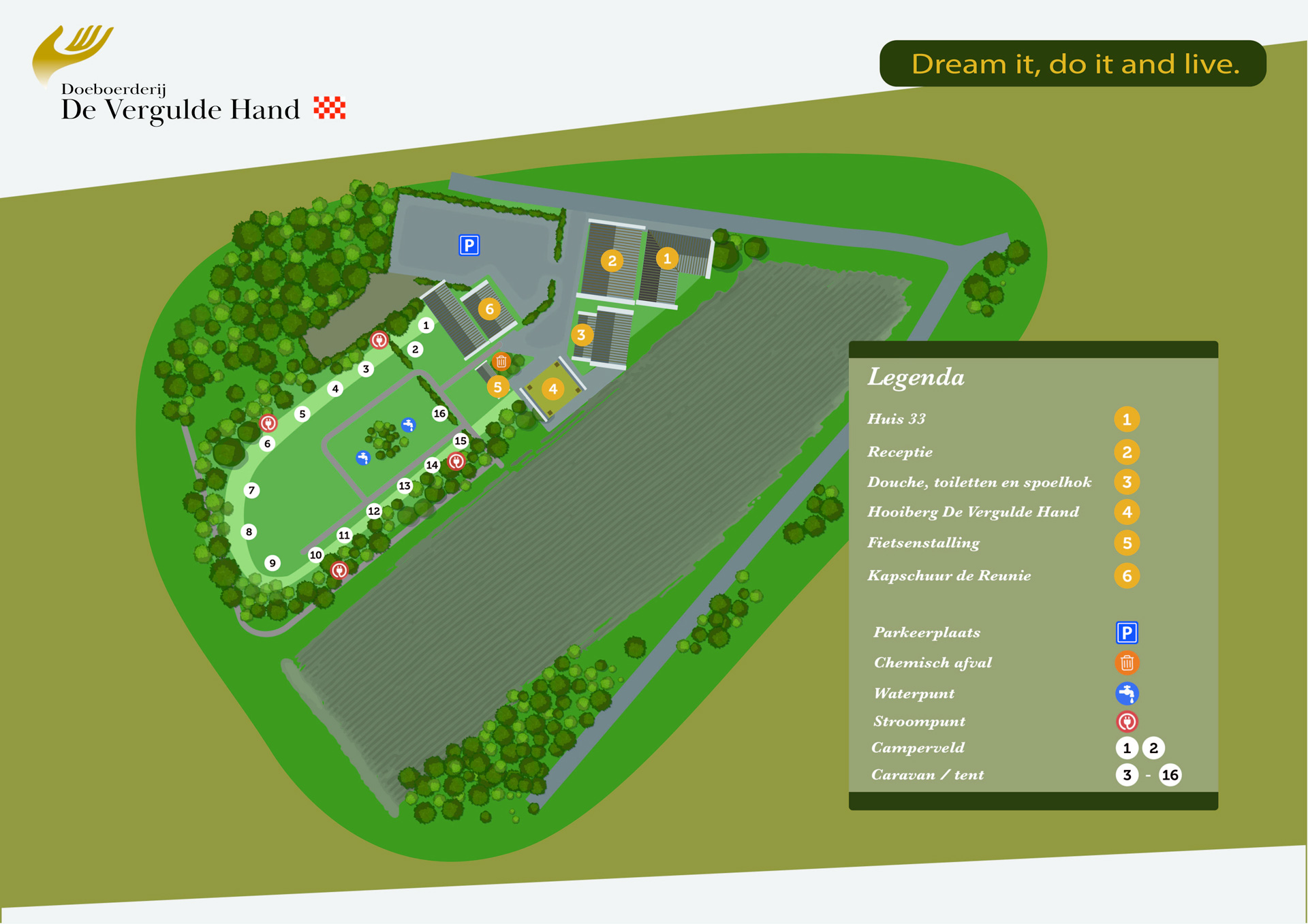 Doeboerderij De Vergulde Hand ist ein gepflegter, gemütlicher und grüner Mini-Campingplatz mit geräumigen Stellplätzen. Ideal, wenn Sie mit einem Zelt, Wohnwagen oder Wohnmobil kommen. Wandern und Radfahren Sie gerne? Dann sind Sie hier genau richtig. In der Umgebung finden Sie viele Wander- und Radwege, die Sie zu den schönsten Plätzen führen.