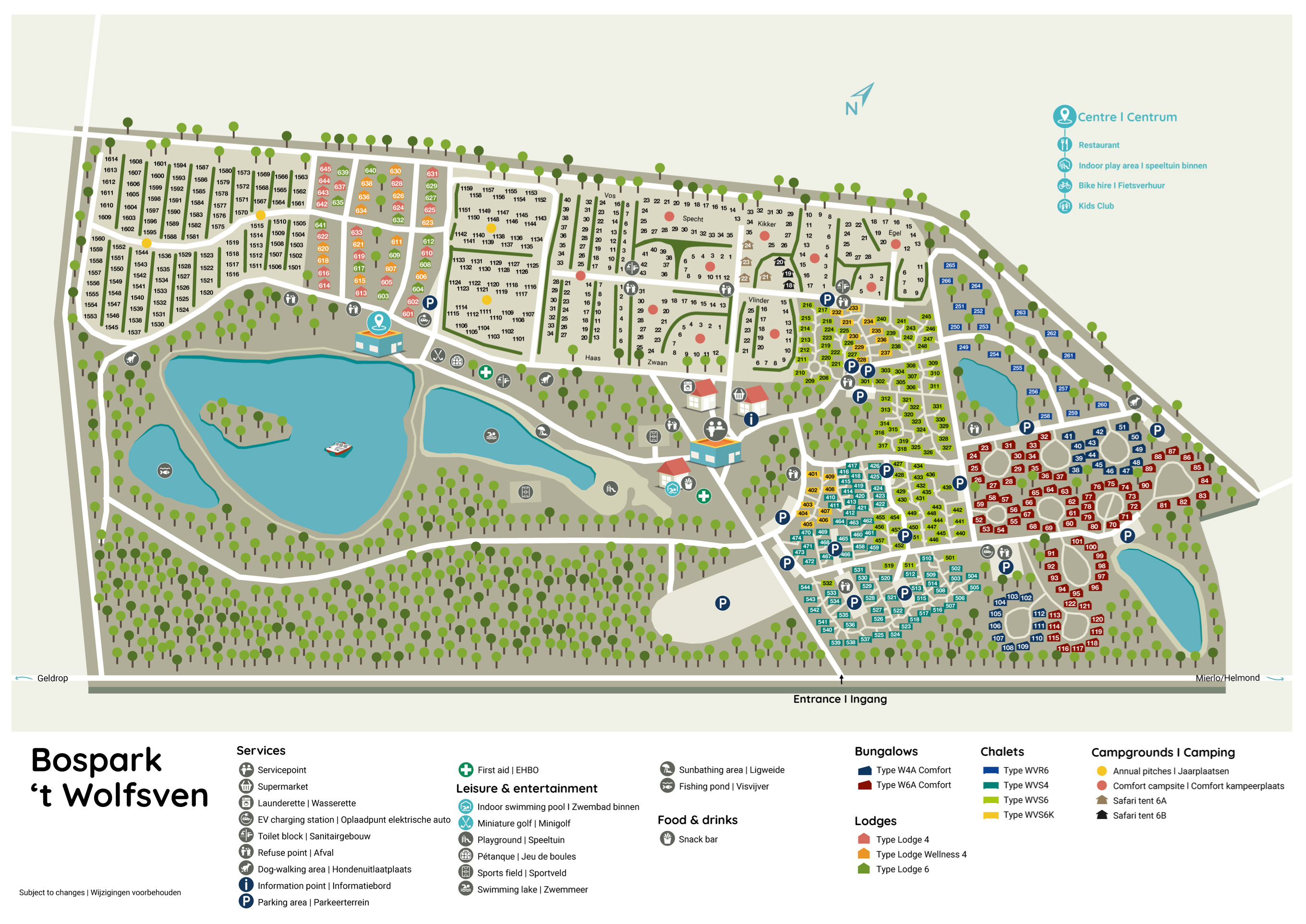 Alle touristischen Stellplätze sind Komfortplätze und liegen in Reihen oder auf Feldern mitten im Wald. Die Jahresstellplätze haben getrennte Bereiche und es gibt auch separate Stellplätze für Camper. Der Campingplatz ist Teil eines größeren Ferienparks, in dem Sie unter anderem auch Chalets und Lodges mieten können. Es gibt zwei weitere Arten von Safarizelten auf dem Campingplatz.