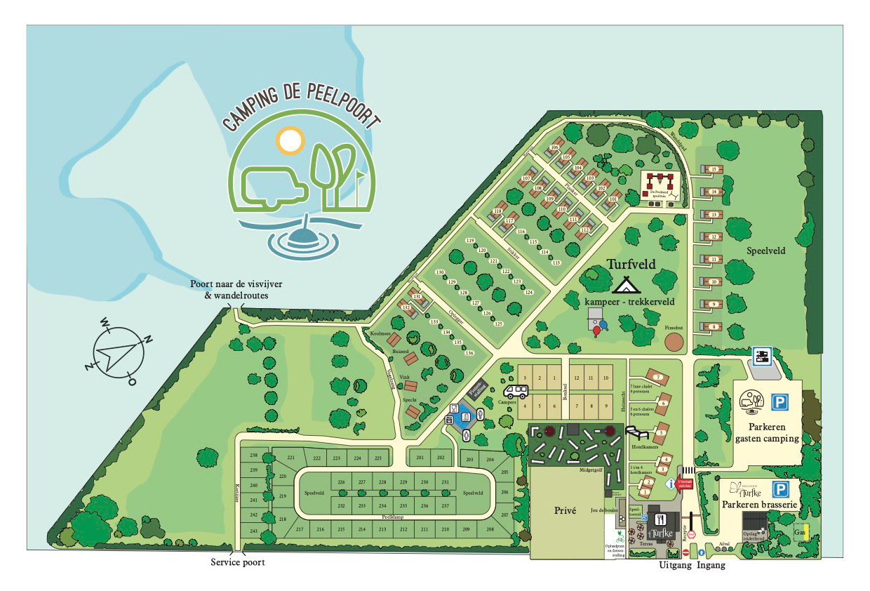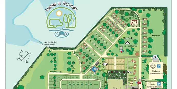 Ferienpark Camping de Peelpoort mit verschiedenen Unterbringungsmöglichkeiten wie Chalets für 2, 4 und 6 Personen, Traktorhütten, Stellplätze für Wohnwagen, Zelte und Wohnmobile. Der Ferienpark liegt in der Nähe eines großen Angelteichs und eines 18-Loch-Golfplatzes und 4 km vom Naturpark De Groote Peel entfernt.