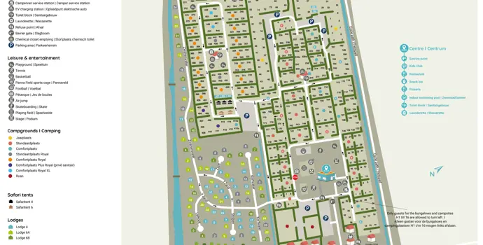 Die Stellplätze befinden sich auf unterschiedlich großen Feldern. Auf dem Campingplatz gibt es viel Grün, Schutz und somit Privatsphäre. Es gibt verschiedene Arten von Stellplätzen, von Standard- und Komfortplätzen bis hin zu Stellplätzen mit eigenen Sanitäranlagen. Sind Sie gerne unter Campern, haben aber keine eigene Campingausrüstung? Dann mieten Sie eines der Safarizelte. Diese sind komplett ausgestattet und verfügen über 2 oder 3 Schlafzimmer. Koos Konijn und das Animationsteam sorgen für ein abwechslungsreiches Freizeitprogramm. Basteln Sie, tanzen Sie auf der Bühne oder spielen Sie einfach auf einem der Spielplätze. Auch auf dem Campingplatz gibt es viel zu erleben. Auf dem Campingplatz gibt es Tennisplätze, einen Panna-Platz, Air-Jump, eine Skateboardbahn, einen Basketballplatz und einen Boule-Platz.