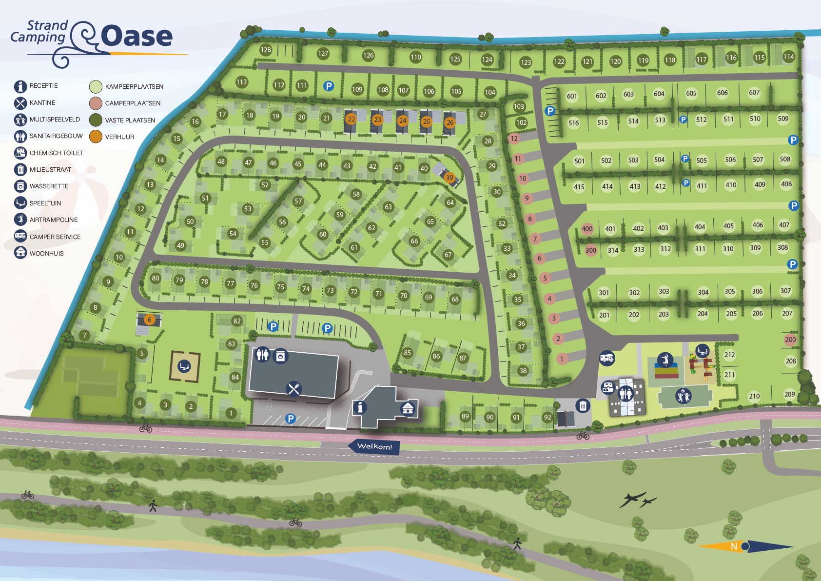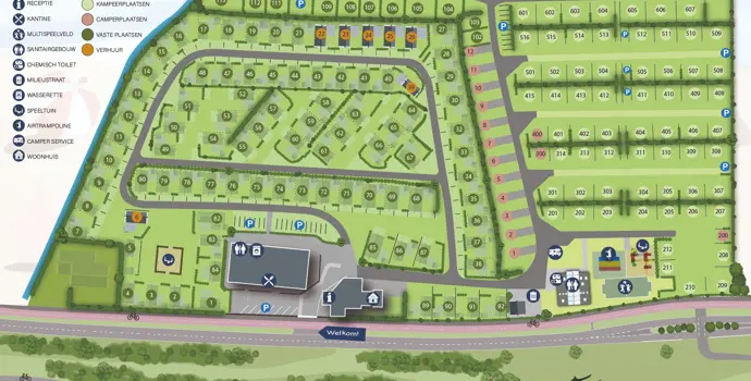 Auf diesem mittelgroßen Campingplatz finden Sie rund 200 Stellplätze, darunter Wohnmobilstellplätze, Dauerstellplätze und 7 Mietunterkünfte für 4/5 Personen. Die Dauerstellplätze sind von den Feldern mit Touristenplätzen getrennt. Das Zentralgebäude des Campingplatzes wird komplett renoviert und im Sommer 2023 eröffnet. Es soll der eigentliche Treffpunkt des Campingplatzes werden. Hier befindet sich auch die Rezeption, deren Mitarbeiter immer für ein freundliches Gespräch oder einen Ausflugstipp zu haben sind. Hier bekommen Sie auch Ihr Mitbringsel für zu Hause oder den einen Drachen, den Sie gleich am Strand einsetzen können. Bleiben Sie noch eine Weile auf der angrenzenden Terrasse, um eine Tasse superfrischen Kaffee vom Barista zu trinken? Ihr Tag beginnt auf jeden Fall mit frischen Brötchen, die Sie, Sie haben es erraten, im Hauptgebäude bekommen können!