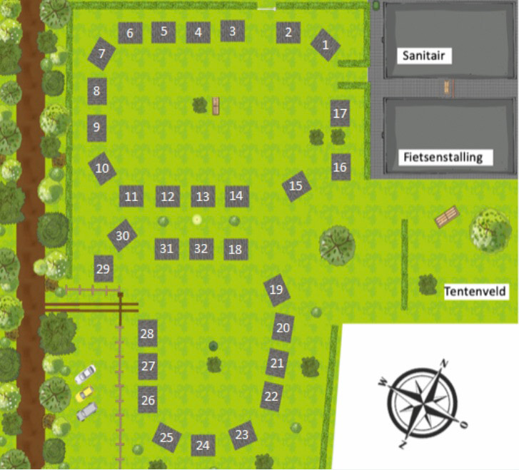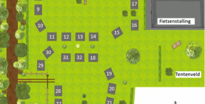 Der Campingplatz verfügt über ein schönes offenes Campinggelände mit 32 geräumigen Stellplätzen für Wohnwagen und Wohnmobile mit Sonne und Schatten und liegt an einer ruhigen Sackgasse (Bosgaarderweg). Es gibt ein separates Feld für Zelte. Außerdem gibt es ausgezeichnete sanitäre Einrichtungen und einen überdachten Fahrradschuppen mit Ladestationen für Elektrofahrräder.