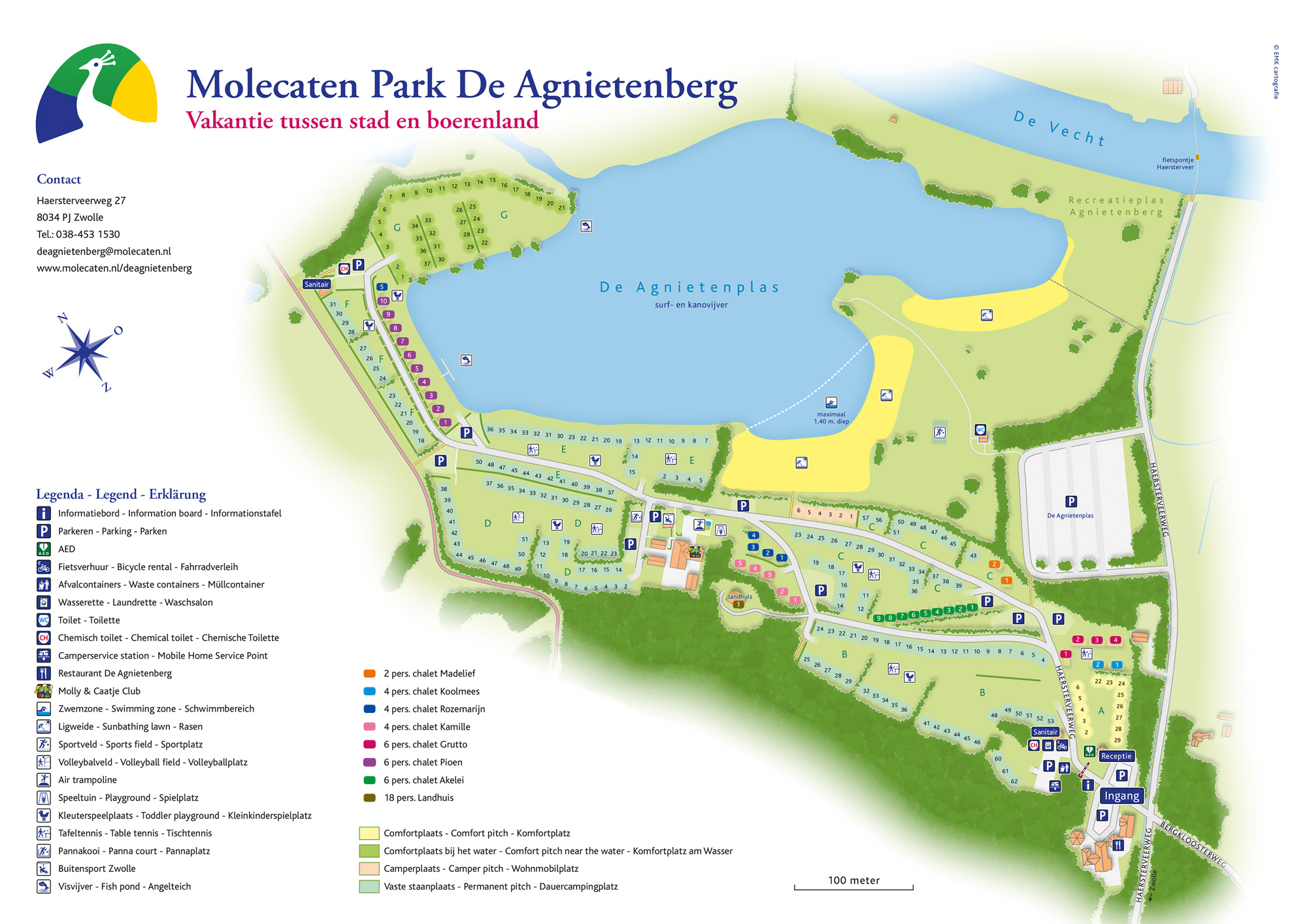 Molecaten Park De Agnietenberg liegt in einem schönen Naturgebiet am Rande der lebendigen Hansestadt Zwolle. Es gibt geräumige Stellplätze auf dem Feld in der Nähe des Wassers des Agnietenplas und Stellplätze auf dem Feld in der Nähe des Waldrandes.