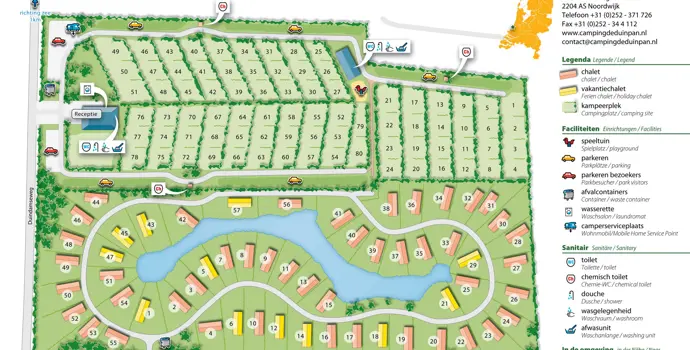 Camping de Duinpan ist ein kleiner, gastfreundlicher Campingplatz in der Nähe des Badeortes Noordwijk. Hier sind Sie das ganze Jahr über willkommen, um die gesunde Meeresluft einzuatmen. Mit einem kurzen Spaziergang durch die Dünen und den Wald erreichen Sie das Meer und den Strand. Am Abend können Sie auf dem lebhaften Boulevard von Noordwijk flanieren.