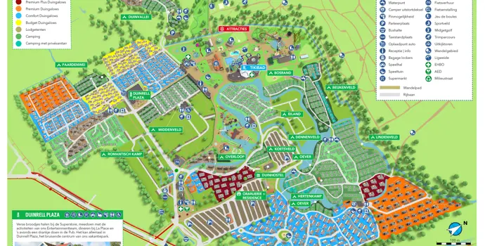 Als Campinggast können Sie aus bis zu 12 Campingplätzen wählen. Ein Platz liegt etwas näher am Eingang des Vergnügungsparks als die anderen. Und wenn Sie mehr Luxus wünschen, wählen Sie einen Stellplatz mit eigenen sanitären Anlagen. Der Campingbereich ist Teil eines größeren Ferienparks, in dem Sie verschiedene Unterkünfte mieten können. Die meisten Einrichtungen befinden sich in und um den Duinrell-Platz, der im Zentrum des Parks liegt. Auf dem Platz gibt es eine große Auswahl an Restaurants, einen großen Supermarkt und für den Abend einen netten Pub, eine Bowlingbahn und eine Spielhalle. Bei schönem Wetter kann man im Park verschiedene Sportarten ausüben, von Fußball bis Beachvolleyball. Gleich draußen im Wald gibt es mehrere Wander- und Laufstrecken. Und wenn Sie wirklich nicht wissen, was Sie tun sollen, hat das Freizeitprogramm ein lustiges Programm für Jung und Alt zusammengestellt, von Yoga bis Floßbau.