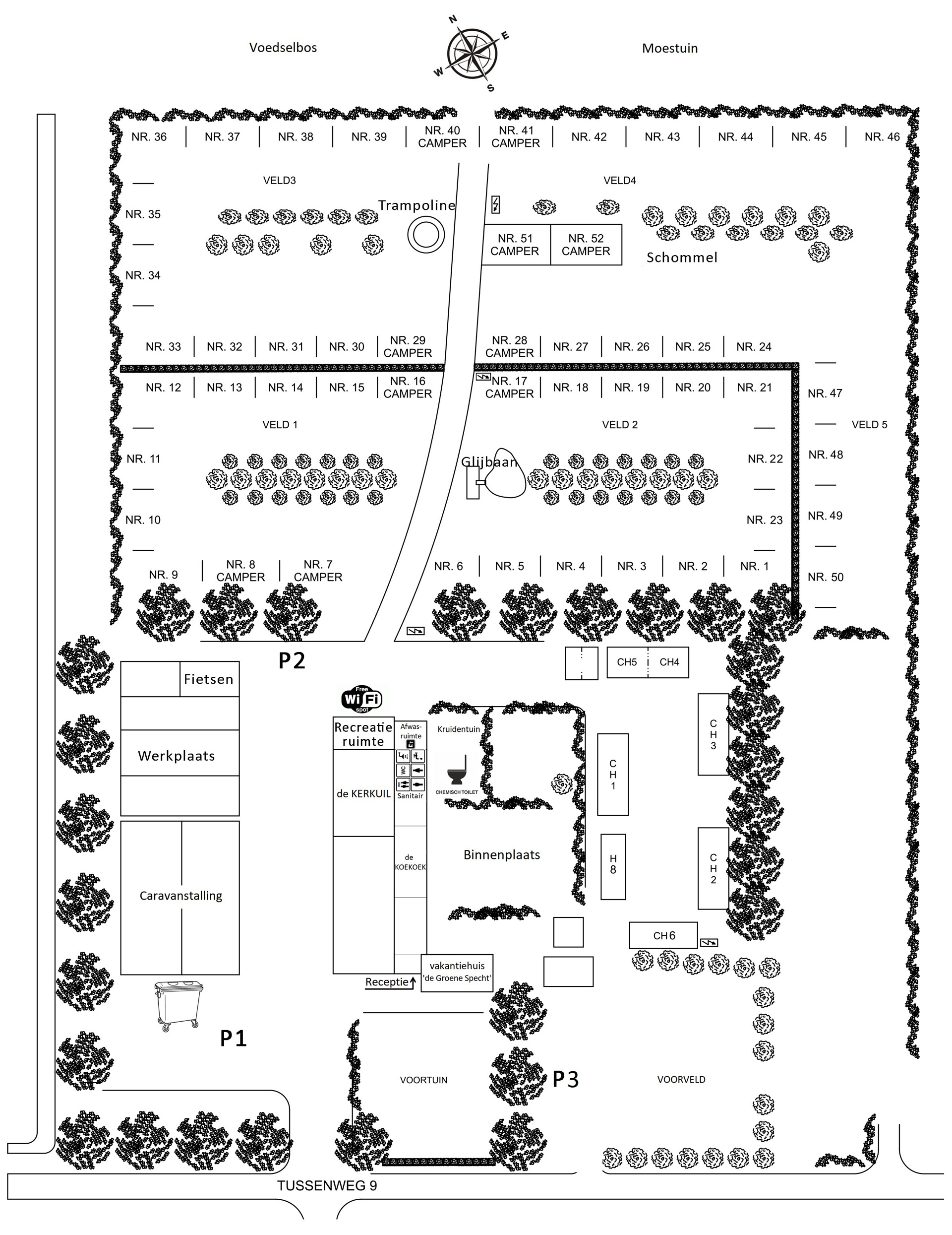Die 50 geräumigen Stellplätze liegen im Grünen und sind von verschiedenen Obst- und Nussbäumen umgeben. Auf diesem Campingplatz tragen wir zu einer besseren, gesunden Welt bei, in der wir in Harmonie miteinander und mit der Natur leben.