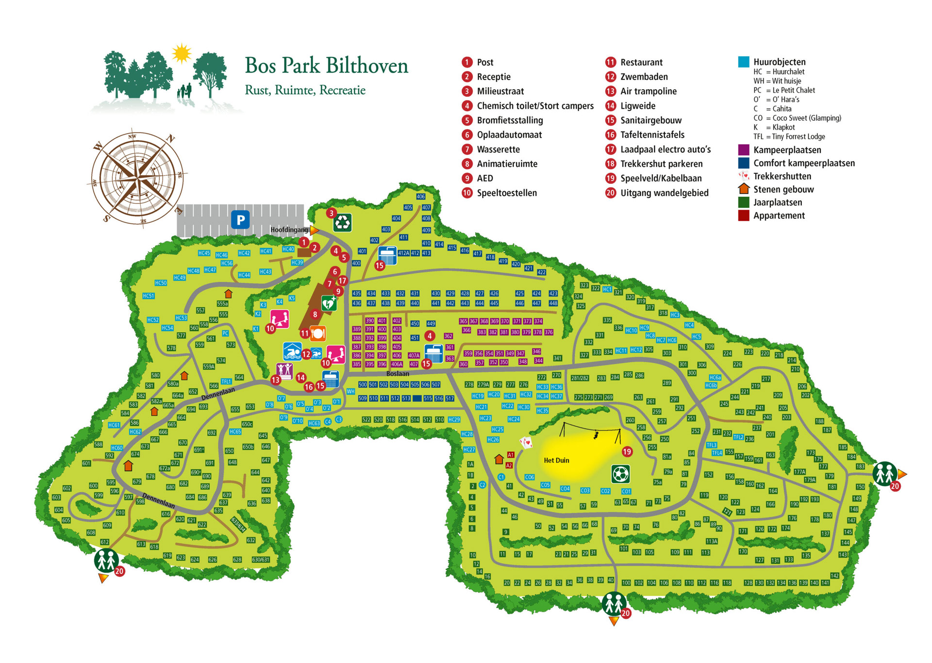 Wälder und Sandverwehungen. Wunderschön zum Spazierengehen oder Radfahren und wahrscheinlich eine ganz andere Umgebung als die zu Hause. Bringen Sie ruhig Ihren Hund mit, denn auch er ist willkommen. Die Umgebung ist zu jeder Jahreszeit schön, deshalb ist der Campingplatz auch von Ostern bis nach den letzten Herbstferien geöffnet. Zu Fuß können Sie das Zentrum von Bilthoven mit all seinen Annehmlichkeiten leicht erreichen. Zurück auf dem Campingplatz können Sie den Daheimgebliebenen eine schöne Urlaubsnachricht schicken.