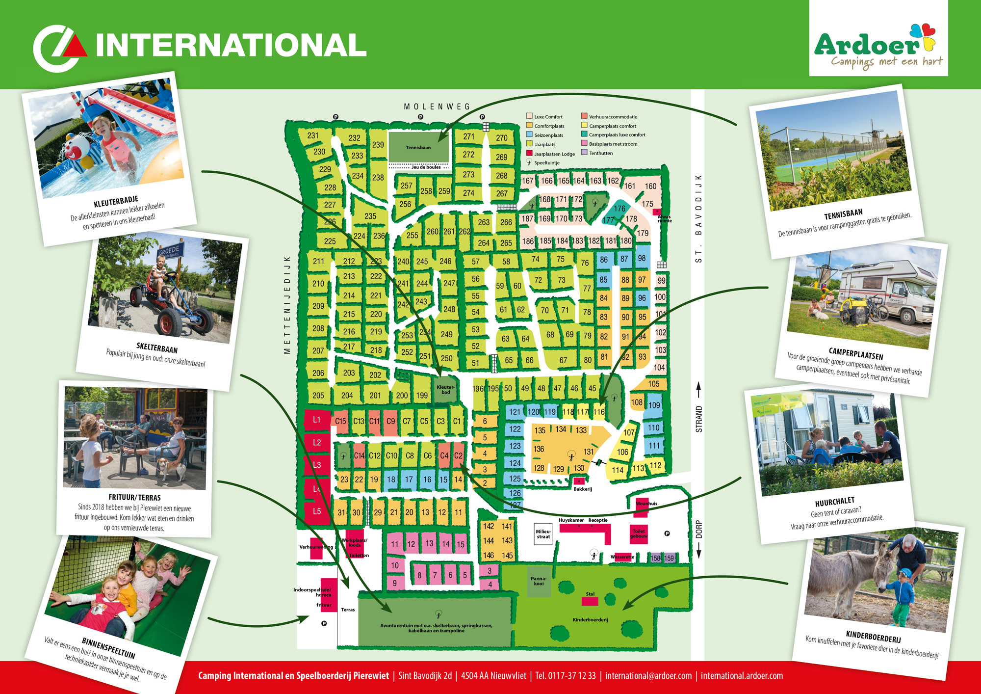 Camping International ist ein ruhiger, kleiner Familiencampingplatz in dem Dorf Nieuwvliet. Kinder können sich auf dem Spielbauernhof Pierewiet austoben, es gibt einen großen Spielplatz mit Spielgeräten, eine Seilbahn und eine Gokartbahn.
