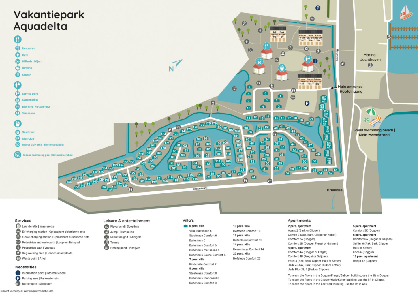 Wenn Sie im Park ankommen, werden Sie feststellen, dass sich die meisten Einrichtungen am Anfang des Ferienparks befinden und um einen gemütlichen Platz angeordnet sind. Bringen Sie Ihre Sachen in Ihrem Ferienhaus unter und erkunden Sie den Park. Das Hallenbad, die Minigolfanlage, der Souvenirladen und der Supermarkt. Sie sind wirklich auf Urlaub. Die Sportmöglichkeiten beschränken sich nicht nur auf den Wassersport im Park selbst, Sie können auch Tennis, Squash, Bowling oder Lasergames spielen. Und das ist nur ein kleiner Ausschnitt aus dem Angebot des Ferienparks Aquadelta.