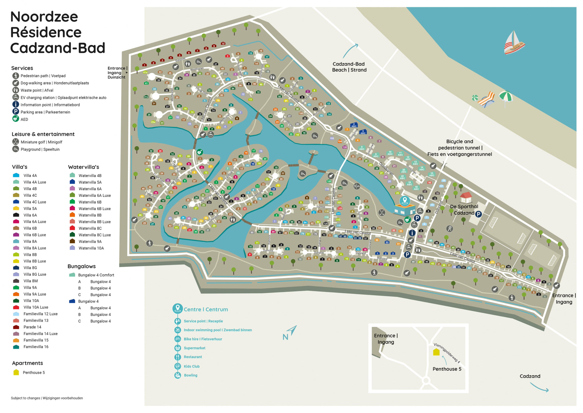 Bei 45 verschiedenen Ferienunterkünften haben Sie die Qual der Wahl. Jede Villa verfügt über einzigartige Extras wie einen stimmungsvollen Kamin, eine überdachte Terrasse, extralange Betten oder einen Smart-TV. Bei der Buchung können Sie Ihre speziellen Wünsche angeben. Auch angepasste Ferienhäuser sind verfügbar. Der Ferienpark ist attraktiv angelegt, mit viel Wasser, Brücken und schönen Aussichten. Und ein Seitenausgang führt Sie durch das Dorf zum Meer. Ideal, wenn Sie frühmorgens einen Spaziergang machen oder den Sonnenuntergang beobachten möchten. Vor Ort brauchen Sie kein Auto.
